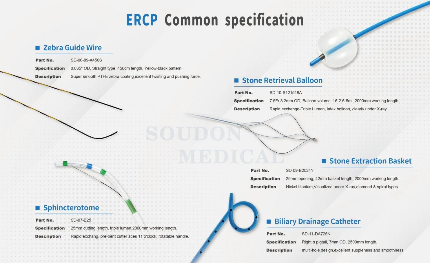 Les principaux produits jetables de Soudon Med comprennent les pinces à biopsie, les hémoclips, les pièges à polypectomie, le sphinctérotome, les aiguilles d'injection d'endoscopie, le fil de guidage Zebra, le panier de récupération d'endoscopie, l'aiguille EUS, la ligature multibande, etc., veuillez télécharger notre catalogue pour votre référence.